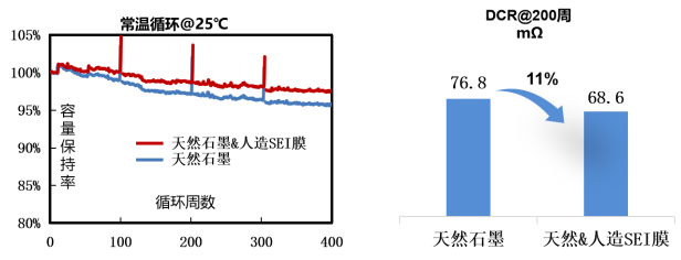 碳一“集成人造SEI膜”技术应用于天然石墨、人造石墨负极具有以下优异性能: